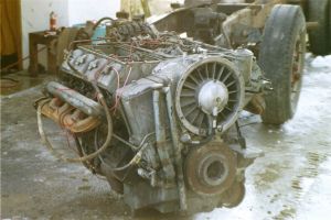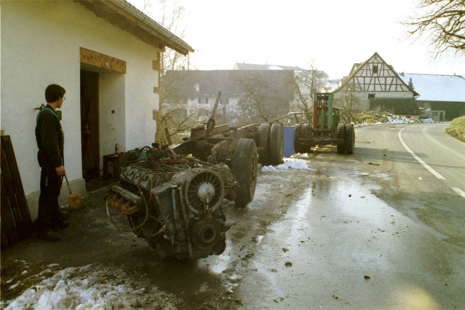 Jetzt wird der Motor erst mal auf die Seite gestellt. Weil's vor der Werkstatt zu eng ist, wird der V8 halt auf die Strasse gestellt. Das Fahrerhaus wird anschliessend ins damalige Werk 2(eine kleine Normgarage) verschoben.